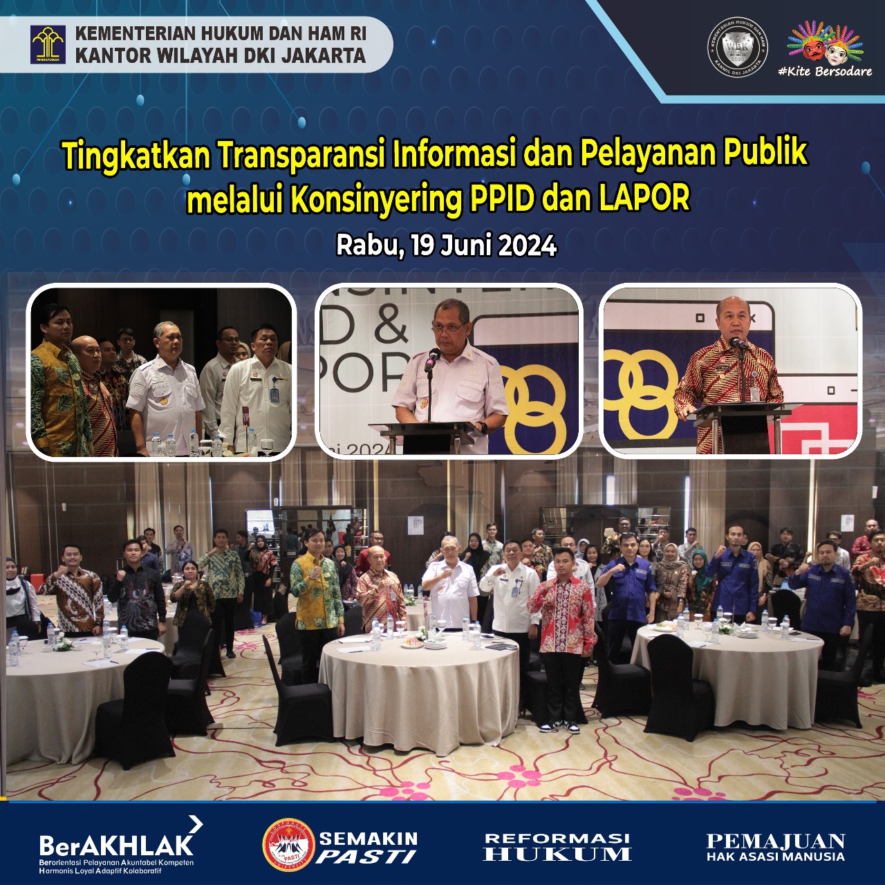 Jakarta - Bertempat di Hotel Plaza Crowne Bandung, Kantor Wilayah Kemenkumham DKI Jakarta mengikuti pelaksanaan kegiatan konsinyering Pejabat Pengelola Informasi dan Dokumentasi (PPID) serta sosialiasi platform Layanan Pengaduan Online Rakyat (LAPOR) dalam meningkatkan transparansi informasi dan pelayanan publik di Indonesia, pada Rabu (19/06/2024). Kegiatan yang dihadiri oleh perwakilan dari Kantor Wilayah dan Narasumber ini bertujuan untuk memperkuat kolaborasi dan pemahaman bersama terhadap prinsip-prinsip pelayanan publik yang efektif dan responsif.